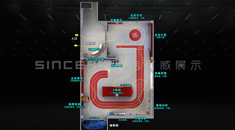 健力寶主題展覽館改造設計項目,信可威的設計方案以“科技感、現代感、互動感”為主,貼合健力寶品牌主色調“中國紅”,融入健力寶企業文化,簡單的增加國潮性元素,同時凸顯了體育品牌,增加了互動體驗區拍照區,加強互動體驗感,給參觀者留下深刻印象。