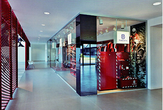 在Husqvarna摩托車總部,寶馬集團(tuán)決定委任Buratti+Battiston建筑設(shè)計(jì)團(tuán)隊(duì)來設(shè)計(jì)他們的新展廳。新建筑坐落在街道的一旁,用兩層高的全透明的玻璃墻打造。議會室、專賣店、摩托車的陳列室也可兼作老式摩托車的展覽廳。這個展廳主要是以紅色網(wǎng)格狀的金屬材質(zhì)打造,使展廳被一層一層的“面”包裹著,遠(yuǎn)觀會留給人留下非常深刻的印象。