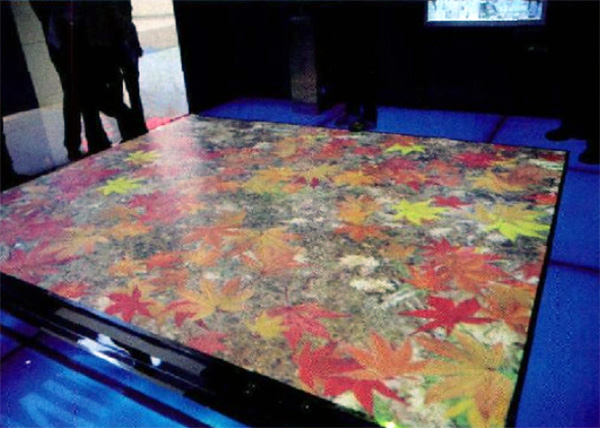 地面互動投影-展區(qū)里有塊IFLOOR互動投影系統(tǒng),它可以將任何的地板轉(zhuǎn)換成一個(gè)多點(diǎn)互動的表面。該系統(tǒng)通過智能圖像傳感器捕捉人體的運(yùn)動,軟件自動識別判斷人體的位置與運(yùn)動狀態(tài),并基于此產(chǎn)生不同層次的互動體驗(yàn)。在這里,既可以漫步在潺潺流水中,微波蕩漾;又可以徜徉在楓樹林中,體味”秋風(fēng)掃落葉” 的景致。